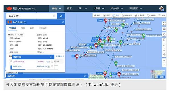 涉嫌切斷基隆港外海國際電纜的中國權宜輪路「順興39」,已將船上至少2套船舶自動識別系統(AIS)關閉失蹤。不過,據AIS資料,同樣航跡可疑的寶順輪,自6日被我國海巡關切,聲稱「主機故障已修復」後,轉往彭佳嶼北方近海,持續以「西南─東北向」進出我12浬線來回繞行長達5天,總里程約達311浬(約575公里)、平均航速不足3節。