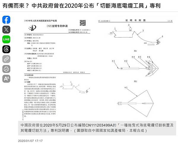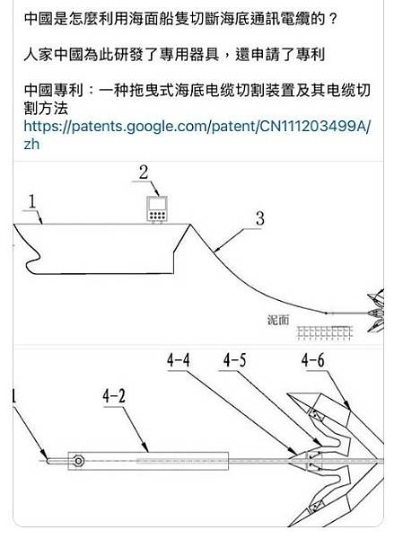 各國網友也對此展開熱烈討論,並有網友發揮柯南精神,找到中國政府曾審請一項鮮為人知的專利技術。根據中國國家知識產權局資料顯示,中國政府曾在2020年5月29日公布編號CN111203499A的「一種拖曳式海底電纜切割裝置及其電纜切割方法」專利說明書,內容介紹如何在船錨上安裝切割刀,好讓拖船船錨在海上運行時,將海底光纜快速的切斷,資料還附上詳細的操作方法過程與切割刀設計圖。