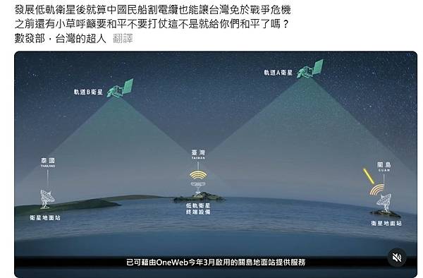 數發部相當努力推動各種備援,包括低軌衛星oneweb,但缺點是傳輸速度比海纜慢許多。國家太空中心現階段正在自主研發,但也需要幾年時間。