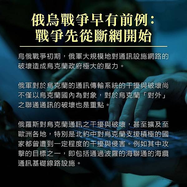 俄羅斯在戰爭前,第一件做的事情就是網路攻擊,讓烏克蘭政府相關網站暫時無法使用,多個地區的網際網路基地台服務嚴重中斷