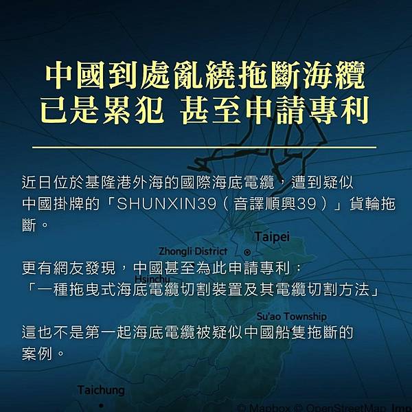 近日位於基隆港外海的國際海底電纜,遭到疑似中國掛牌的「順興39」貨輪拖斷。