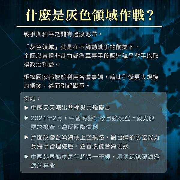 關鍵基礎設施(如網路、機場、港口等)需加強保護,這些不可能由軍警做,其勢必成為中國灰色地帶目標,因此民間防衛組織非常重要。