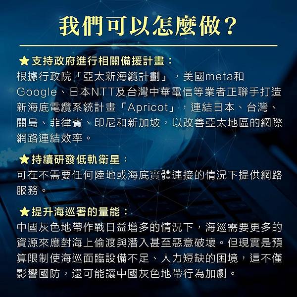 該人士指出,無論是國際上多數國家面臨相同狀況,或此次台灣周邊的國際海纜遭到破壞,都說明這已並非單一國家的議題。