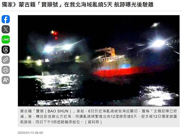 另外,本月6日被揭露航跡異常的蒙古籍「寶順(BAO SHUN)」號貨輪,當時海巡稱是「主機故障」,修復後已朝東方方向「駛離」。不過,經記者追查,寶順僅向東北方移動約30浬(約55公里),截至今天凌晨2點,仍在彭佳嶼北方約15浬(約18公里)處來回繞行,緊鄰我領海線,行跡可疑。