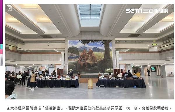 ▲大林慈濟醫院遭控「侵權換畫」,醫院大廳擺放的壁畫幾乎與原圖一模一樣,寫著陳欽明恭繪。(圖/翻攝畫面)