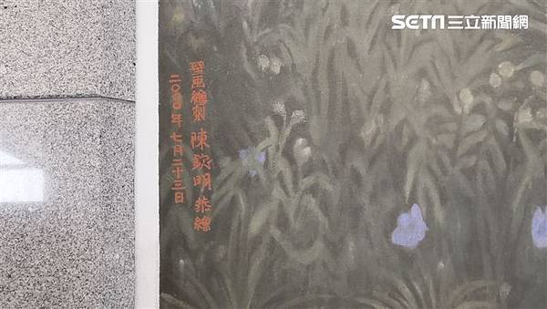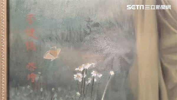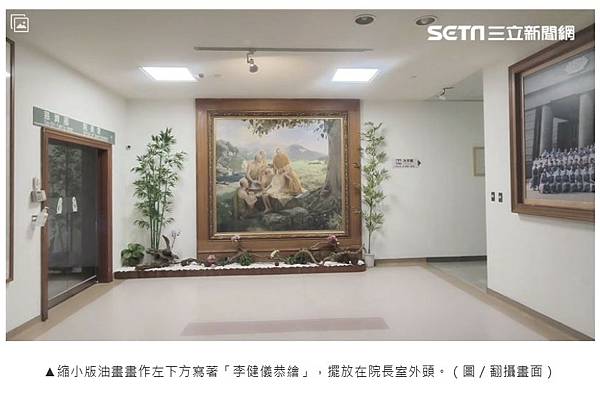 縮小版油畫畫作左下方寫著「李健儀恭繪」,擺放在院長室外頭。(圖/翻攝畫面)