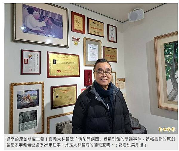 〔記者洪美秀/新竹報導〕作家苦苓近期提及嘉義大林慈濟醫院的「佛陀問病圖」涉偷畫盜圖爭議,引發各界關注,也讓這起已25年的往事重新被提及,這幅「佛陀問病圖」原創者是知名油畫家李健儀,也還原這段畫作創作始末,強調大林醫院的聲明是對原創藝術家遲來的正義與尊重,但他不願傷害證嚴上人及醫院,也相信他的藝術歷史地位禁得起檢驗。