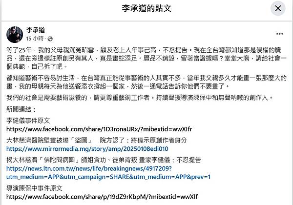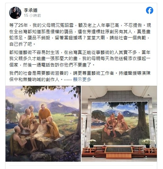 大林慈濟被控盜畫 原作李健儀之子:贗品不銷毀當證據嗎? (3) 李承道 - 等了25年,我的父母親沉冤昭雪,顧及老上人年事已高,不忍提告。現在全台灣都知道那是侵權的贗品,還在旁邊標註原創另有其人,真… | Facebook