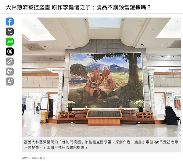 〔即時新聞/綜合報導〕嘉義大林慈濟醫院的「佛陀問病圖」涉偷畫盜圖爭議,針對院方表示將在壁畫前標示製作原由及原創者身分,原創者、知名油畫家李健儀雖表示不願提告,不過,他的兒子李承道在臉書發文質疑,「現在全台灣都知道那是侵權的贗品,還在旁邊標註原創另有其人,真是畫蛇添足。贗品不銷毀,留著當證據嗎」?