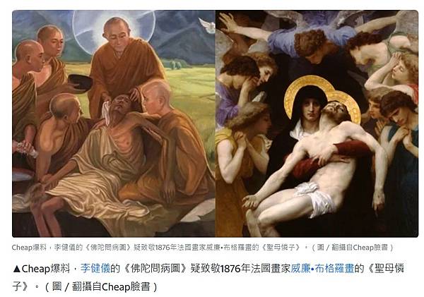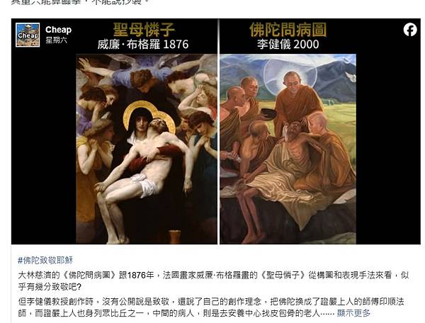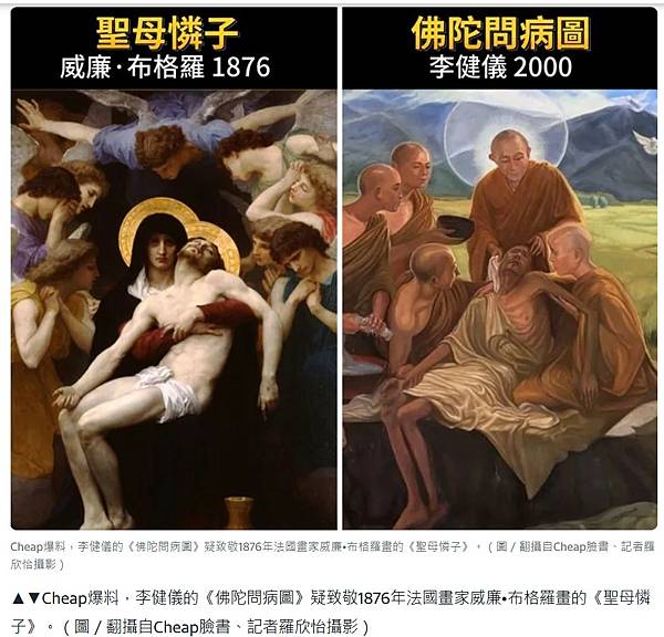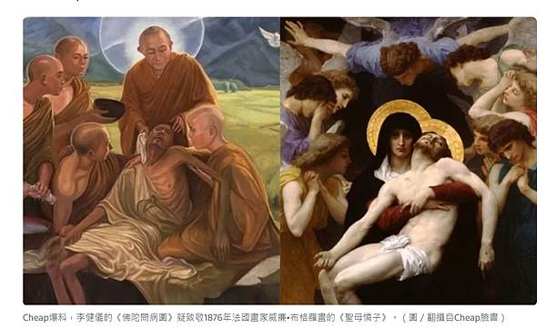 Cheap近日在社群以「佛陀致敬耶穌」為題,並寫道,大林慈濟的《佛陀問病圖》跟1876年,法國畫家威廉•布格羅畫的《聖母憐子》從構圖和表現手法來看,似乎有幾分致敬吧?但李健儀教授創作時,沒有公開說是致敬,還說了自己的創作理念,把佛陀換成了證嚴上人的師傅印順法師,而證嚴上人也身列眾比丘之一,中間的病人,則是去安養中心找皮包骨的老人,這幅畫的構圖是否參考了《聖母憐子》?