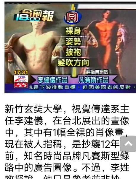 可能是 3 個人和顯示的文字是「高國報 1800 同 裸身 姿勢 披袍 髮吹方向 17:31 TYBS 四|開播音網站 翻攝自網站 NEWS 李健儀作品 李健儀作品凡寶斯作品 凡寶斯作品 55 就是下波推動目標 5是下波推動目標, 六是下波推動目標,但因美國表態 但因美國表態反對 新竹玄类大學,視覺傳達系主 視覺傳達系主 新竹玄裝大學, 任李建儀, 狂李建儀,在台北展出 在台北展出的畫像 中, 其中有1幅全裸的肖像畫, 現在被人指稱, 現在被人指稱,是抄裏124 是抄襲12年 前, 知名時尚品牌凡賽斯型錄 路中的廣告圖像。 不過, 李姓 均博之公 收口日女並上小」的圖像 https://www.facebook.com/share/p/1EQ7zGHVe7/