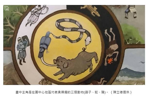 畫中主角是在圖中心地區代表貪嗔癡的三個動物(鴿子、蛇、豬)。 (陳立德提供)