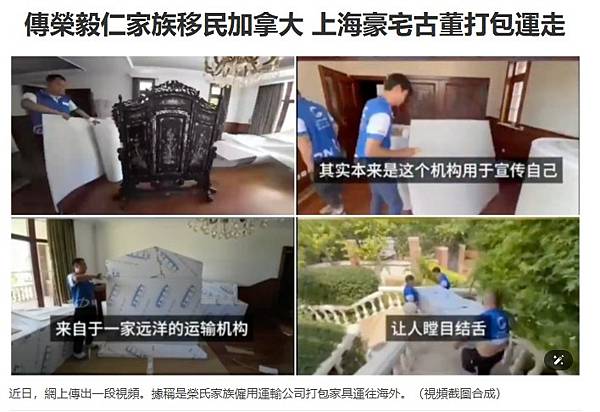 近日,網上傳出一家遠洋運輸公司為一棟上海獨棟豪宅內疑似古董家具打包和搬家的視頻。消息稱,這是是榮氏家族僱用了運輸公司打包珍貴家具,運往加拿大。