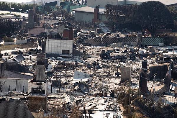 洛杉磯郡多個野火已摧毀約1.2萬棟建物。圖為太平洋斷崖野火肆虐後,災區一片廢墟。(法新社)