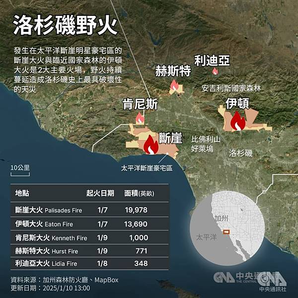 〔即時新聞/綜合報導〕美國加州洛杉磯郡野火持續蔓延,天乾物燥、缺水,加上風勢助長,多處火勢齊發,其中規模最大的是太平洋斷崖野火(Pacific Palisades Fire),已燒毀2萬2660英畝(約91.7平方公里),僅11%範圍受控制。自上週二(7日)以來,洛杉磯郡野火已知造成13人死亡,摧毀約1.2萬棟建物,目前仍有13人失蹤。