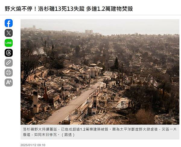 野火燒不停!洛杉磯13死13失蹤 多達1.2萬建物焚毀 - 國際 - 自由時報電子報 https://bit.ly/4hexfL7