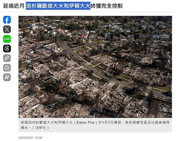 延燒近月 洛杉磯斷崖大火和伊頓大火終獲完全控制 - 國際 - 自由時報電子報