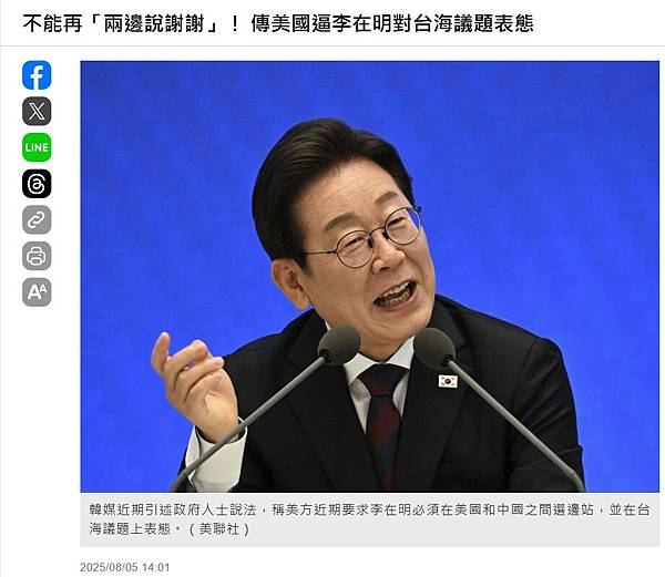 李在明去年3月曾批評當時尹錫悅政府的對中政策,質疑尹「為何刺激中國」,並公開表示無論台灣海峽發生什麼事都與南韓無關,南韓都不應介入。李在明說:「我們只須發展好自己,對中國和台灣都說聲謝謝就可以了。」今年6月3日總統大選前,美國《時代雜誌》5月29日刊出李在明專訪,李被問及若中國武力犯台,他是否會協助台灣?李在明則回應:「要等外星人入侵地球時,我才會思考這個問題的答案。」"不能再「兩邊說謝謝」! 傳美國逼李在明對台海議題表態 - 國際 - 自由時報電子報" https://news.ltn.com.tw/news/world/breakingnews/5132867