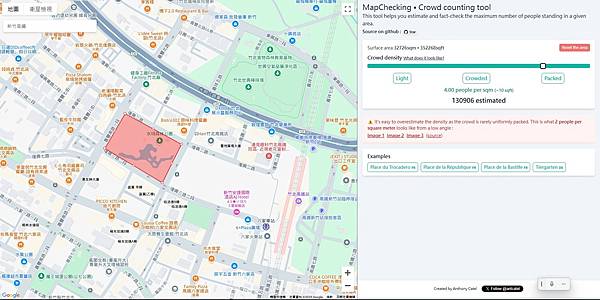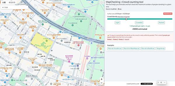 楊斯棓進一步指出,親赴現場的四叉貓估1萬5,跟我用MapChecking抓集會範圍,以crowded來估算聚集程度的答案很接近