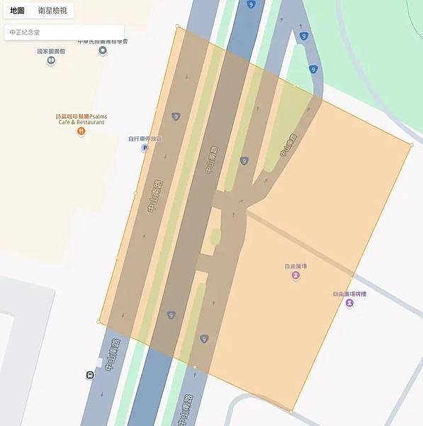 有多少人?他使用軟體「MapChecking」搜尋欄可以輸入:中正紀念堂(或自由廣場),然後就會秀出附近的google地圖。先界定集會範圍,不吃人豆腐,就以台灣民眾黨公布的範圍來評估:自由廣場前到中山南路側。