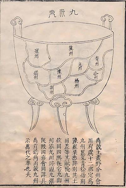 明代嘉靖年間,出現了一部呈現《九鼎圖》具體樣式的《大禹九鼎圖述》,該書為王希旦著,林翰校,目前可見明崇禎時期張英刊本(現藏日本內閣文庫)。嘉靖十九年( 1540 年),時任禮部郎中王希旦在祠部公署撰《大禹九鼎圖述》。祠部,官署名,掌宗廟祭祀、少數民族、疆域地圖、田獵、屯田、土木工程之政令。王希旦任職祠部公署,應熟知歷代存世地圖。