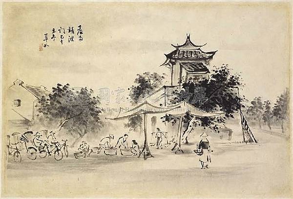 畫家蔡草如於1919年生,原名錦添,臺灣臺南人。畢業於日本川端畫學校( 日本畫),此圖成於1949年,這幅《台南靖波門》,描寫的是畫家故鄉尋常的景象。畫家以簡練的線條,描寫鄉土的景物,在城門樓下的空地,小販搭起棚子,做起買賣;婦女挽著提籃、挑著擔子,前來「靖波門」趕集,三輪車伕們在樹蔭下休息,一面等待生意,一面閑聊,今日繁忙的工商業社會,這樣的生活景象已是不可多見。全篇畫作,以敘事性的表現為主,構圖單純,樹與地面的部分僅稍微罩染,無設色,旨在表現「靖波門」前的人文景象;時代變遷,讓人欣賞這幅畫時,不禁興起懷舊的鄉愁。 出處:國立臺灣美術館典藏詮釋資料。靖波門|國家文化記憶庫 2.0 https://bit.ly/40h5Ukw