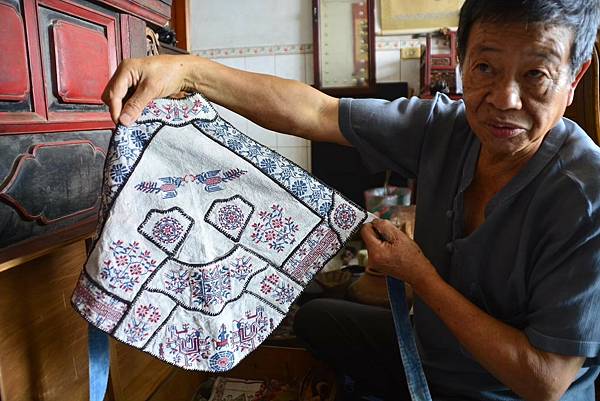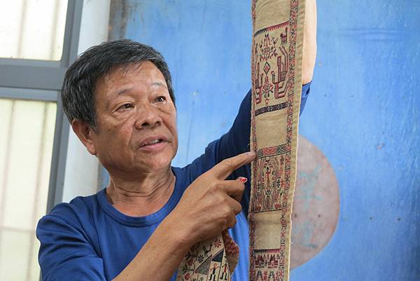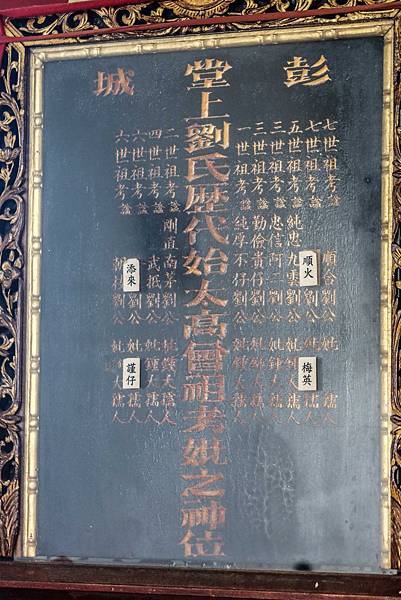 劉增榮關心道卡斯族文化的變遷,他指著家中的堂號說,清朝賜姓「劉」後,也用了地望堂號「彭城堂」。何來美攝