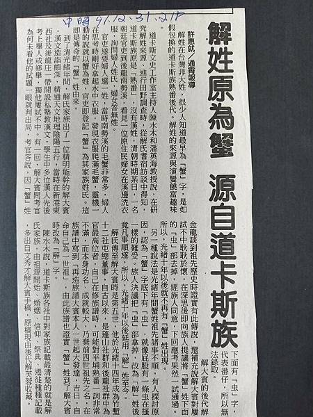 【平埔族群的罕見姓氏】「蟹大賓」姓氏的由來?從「蟹」姓到「解」姓 曾留下一首「悲憤詩」吾祖始居荷蘭城〔2013-08-29〕