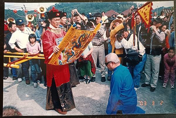 那幾年他家運不好,有幾位親人過世,有回他到造橋豐湖村解家蒐購古文書,天賜佛院正在興建,有尊廣澤尊王神像被丢棄在倉庫,竟連續託夢給他,乃與太太林秀英焚香擲筊請示,若保佑他會帶回家奉祀,結果連續聖杯,如今廣澤尊王與祖先牌位並祀已廿餘年,不僅家運變好,讓他賺了錢,他也給祂打了塊金牌。