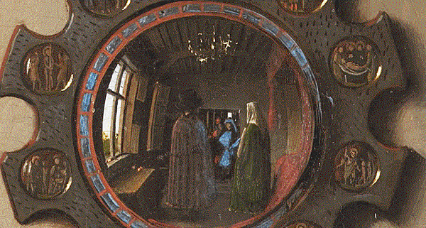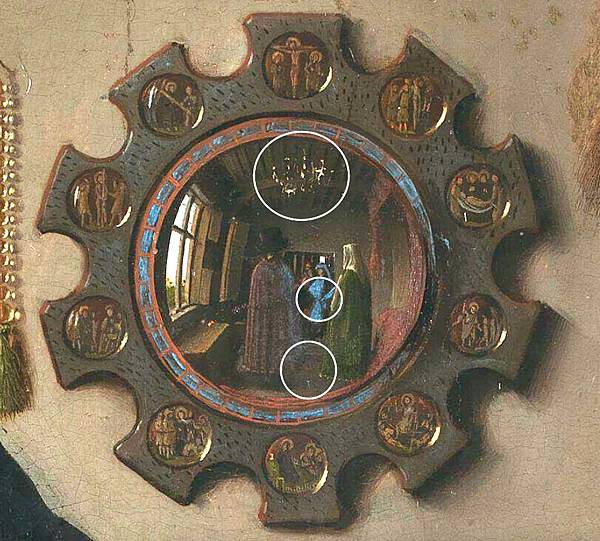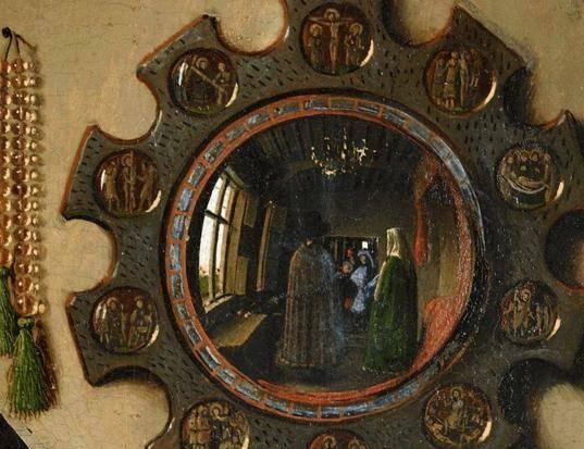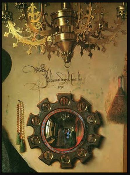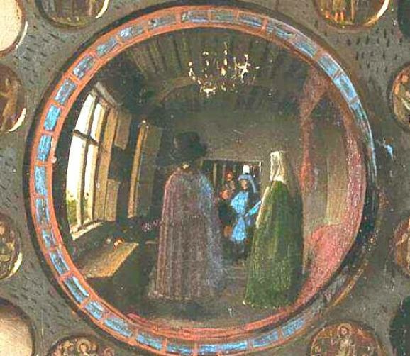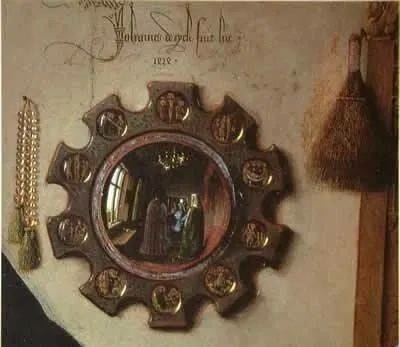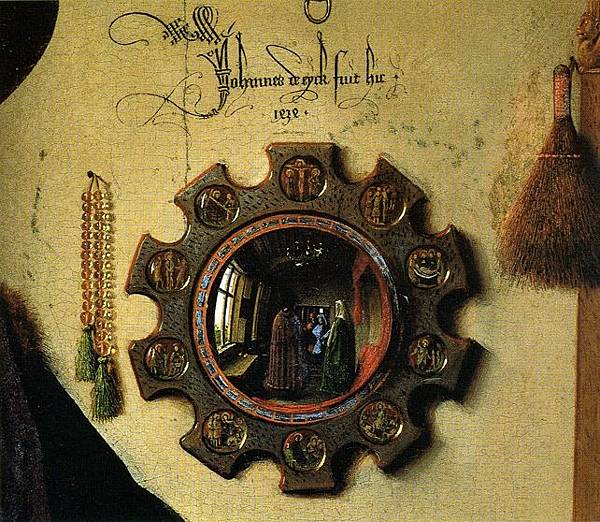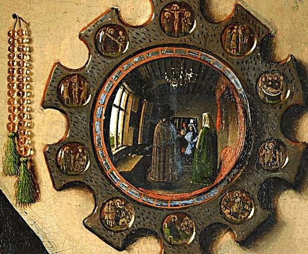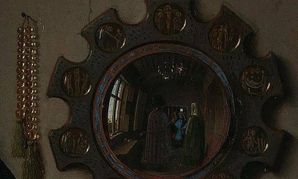正如展覽的名稱「映像」(Reflections)所暗示的那樣,展覽的重點在於鏡子以及鏡子所反射出來的圖像。在《阿諾芬尼夫婦像》中,雖然鏡子佔據的空間並不大,但卻處在視覺的中心點。正如委拉斯貴支的《宮娥》映射出身在畫外的國王夫婦一樣,《阿諾芬尼夫婦像》中的凸透鏡也映照出了本「不該」出現的人物。鏡中夫妻倆中間是兩個男性的身影,一個身穿紅色長袍,一個身著和新娘內襯裙顏色相同的藍色長袍。鏡子上方是畫家寫下的文字:「Johannes de eyck fuit hic 1434」——「1434年,揚·凡·艾克在此」。那麼,如此說來,兩個男性中定有一個是凡·艾克。如果順著這個邏輯往下走,喬萬尼舉起的右手很可能是在朝藝術家致意。如果像許多人認為的那樣,這幅畫有一種「結婚證書」的性質,那麼無疑的,藝術家則是他們婚姻的見證人。這面小小的凸透鏡,不僅向我們展示了藝術家的技藝有多精湛,也為作品增加了新的敘事性內容。