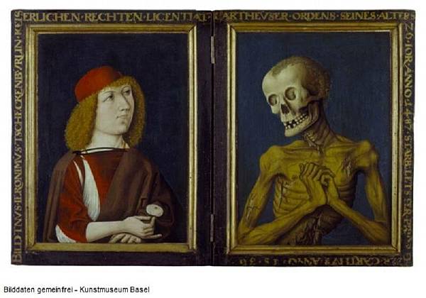 另一方面,將生者與死者並置的圖像在當時並不罕見。如藏於巴賽爾美術館的一幅雙摺畫中【圖2】,藝術家就將一位男子與處於腐爛階段的骷髏放在一起。而事實上范.艾克也確實在畫中放了許多提示,試圖告訴我們右邊的女子可能已經過世。8