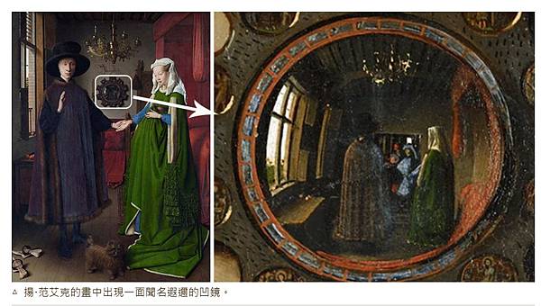 我們還可以注意到,有一面映照著豐富影像的凹鏡(下圖左),那是一面聞名遐邇的凹鏡,鏡子中的景色顯示出這對夫婦面對的門內有兩個人影,一個是藍衣騎士,身旁一個紅衣騎士,可能就是藝術家揚·范艾克的自畫像。荷蘭名畫:《阿諾菲尼的婚禮》 https://bit.ly/3WX7kjt