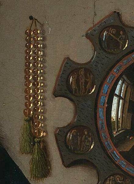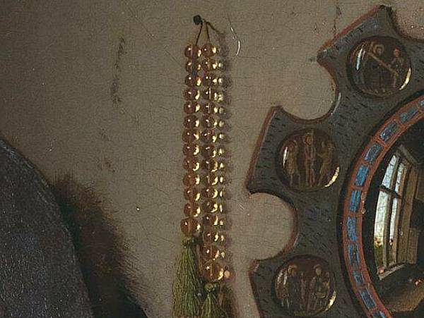 2. 鏡子中帶有基督受難場景的紀念章象徵著這個世界的脆弱。從下順時針方向:“為聖杯祈禱”、“被拘留”、“彼拉多面前的基督”、“鞭打”、“背著十字架”、“受難”、“從十字架上下來”、“埋葬” 、「下降」 「下地獄」、「復活」。凡艾克通常會在畫面中放置許多福音符號:對他來說,重要的是強調我們都行走在上帝之下,世界是短暫的,在日常生活的喧囂中我們不能忘記這一點。