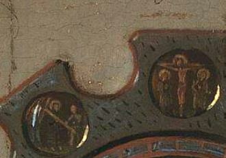 而在正中間的鏡子的外圈,畫有12幅耶穌受難場景的圓形纖細畫,靠近阿諾菲尼的六個場景畫的都是耶穌仍然在世的圖像:從花園中的苦惱(緊接著最後的晚餐的故事場景)到耶穌在十字上受難,靠近女子那邊則是耶穌死亡後的場景,包含放下十字架到耶穌復活圖。10
