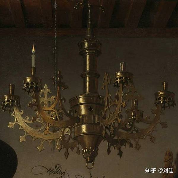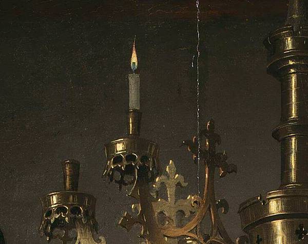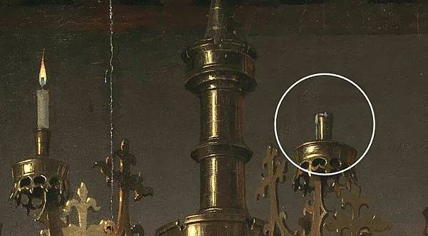 巨大的燭台上,其實有兩根蠟燭,左邊靠近阿諾菲尼的蠟燭仍然燃燒著,但是在右邊,也就是靠近女子的那側的蠟燭,卻已經燃燒殆盡,而只剩下見底的融蠟了。9