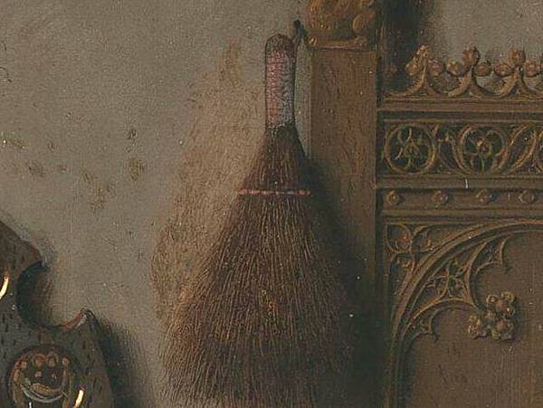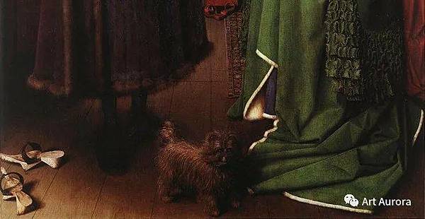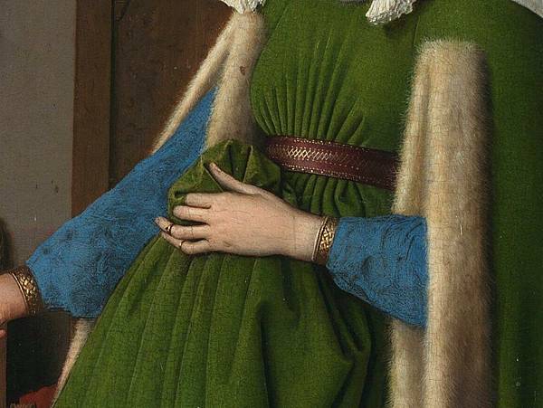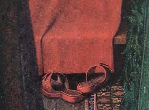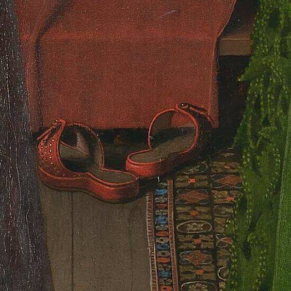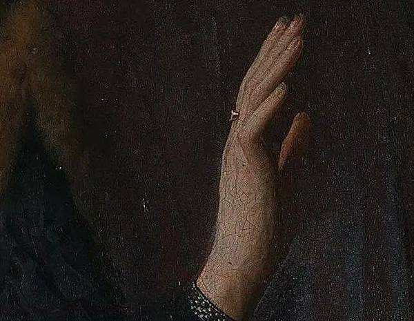 《阿諾菲尼的婚禮》它被認為是西方藝術中最原始和最複雜的繪畫之一,畫中人都脫了鞋,代表聖潔,暗示正進行神聖儀式,即結婚。畫中女人頭戴白頭紗,亦暗示正在結婚。