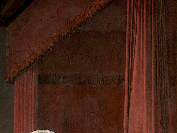 我們沒有談論外面的櫻桃,也沒有談論窗戶上方讓光線進來的吹製玻璃拱門:這兩個物體代表天堂。丈夫站在前面,作為中介,我們可以把他右手的手勢解讀為祈求妻子得救。