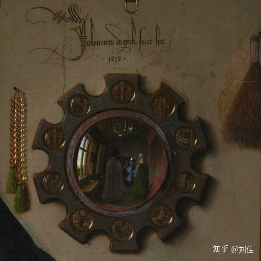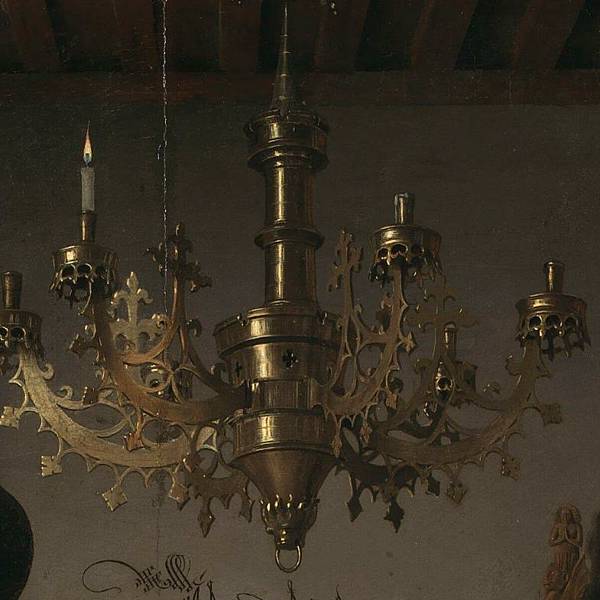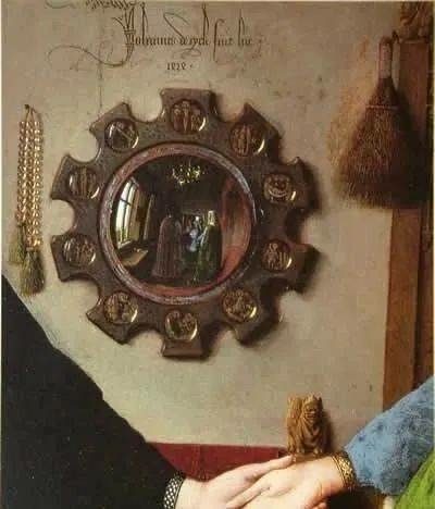 1. 鏡子 既是上帝全視之眼的象徵,也是審慎的象徵(在喬托和喬凡尼貝利尼的審慎寓言中,鏡子以這種身分出現),因為締結婚姻或生意的結合無疑是合理的行動。鏡子裡映出兩個人影。這些人很可能是簽約時在場的證人。其中一位就是凡·艾克,與傳統相反,在構圖中央的鏡子上方刻有拉丁文銘文,證明了這一點:“揚·凡·艾克曾在此。”這就是通常簽訂合約的方式。