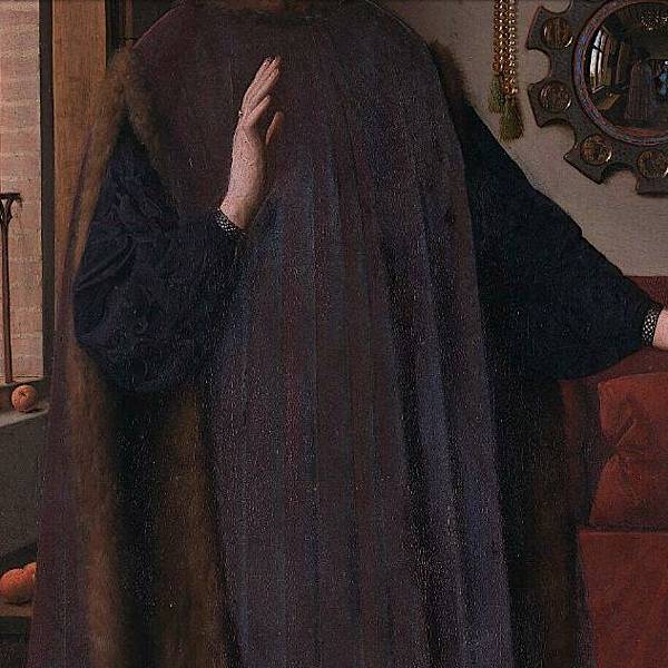阿諾芬尼雖不似同時期的貴族那般渾身珠光寶氣,但一身鑲貂絨的黛紫色皮草外袍和考究的墨色緞面底衫,已赫然展示了他不菲的身價。