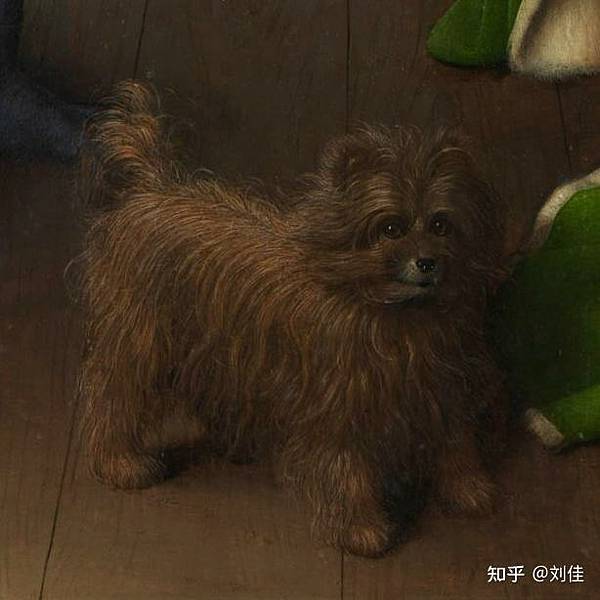 這位女子身穿鮮綠色的袍子,一手扶著稍稍隆起的腹部,身旁的男子牽起了另一手,他身著深色天鵝絨裁製的袍子,嚴肅地看向左前方,他們站在一張頂著紅色帷幕的床前,腳邊毛茸茸的小狗看著我們。雖然比不上《蒙娜麗莎》,《阿諾菲尼的雙人肖像》也是世界數一數二的名畫,但在這樣簡單的描述背後,這些現代人眼中再也明顯不過的婚姻要素,卻讓藝術史學者們傷透了腦筋。