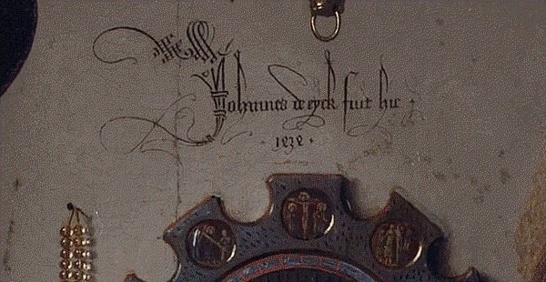 畫家於鏡上方位置簽名:"Jan van Eyck was here."