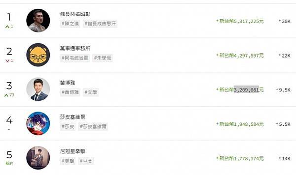 而後續的第3名至第5名則分別為「苗博雅」、「莎皮塞維爾」、「尼剋星拳擊」。台北市議員苗博雅惦惦吃三碗公,竟也出現在榜單上,光2024年YouTube的斗內就收了320萬9081元,不少網友認為苗博雅問政條理清晰,且近來搭上京華城案的議題,苗博雅時常直播在線發表自己的看法,也對其中法條進行講解,擄獲不少觀眾支持,更向上竄升73個名次。2024台灣YT斗內排行出爐!苗博雅收320萬元衝上第3名 這人狂撈逾530萬元居冠 https://bit.ly/3WKQVyh