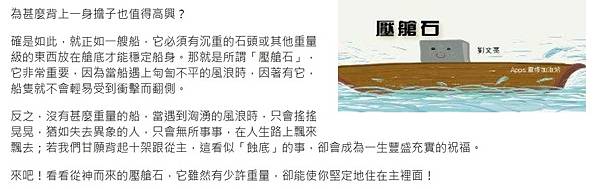一艘船,它必須有沉重的石頭或其他重量級的東西放在艙底才能穩定船身。那就是所謂「壓艙石」,它非常重要,因為當船遇上匉訇不平的風浪時,因著有它,船隻就不會輕易受到衝擊而翻側。反之,沒有甚麼重量的船,當遇到洶湧的風浪時,只會搖搖晃晃