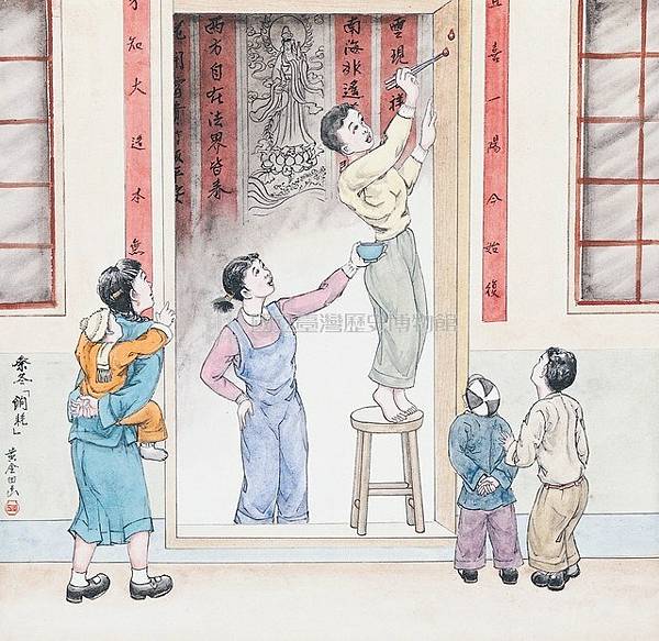 1.黃金田所繪民俗畫《祭冬餉秏》,描繪冬至習俗,將湯圓黏在大門上(俗稱糊圓仔丁),藉以祈福。畫作題跋為「祭冬「餉秏」,黃金田畫」。 2.推測畫作年代為1999至2004年間,黃金田開始繪畫民俗畫至本館購藏期間所繪。 3.每年國曆的十二月廿二或廿三日,是二十四節氣中的「冬至」,這天可說是整年中日照時間最短的一天,而此日一過則又開始進入日長夜短的型態。冬至,也是民間推測來年天氣的依據,所以俗話說:「冬至在月頭,耍冷在年兜(底);冬至在月尾,耍冷在正月;冬至在月中,無雪亦無霜。」 冬至這天,也是吃「冬節圓」(湯圓)的日子,所以在此之前,家家戶戶都在搓揉著湯圓。當天早上,便以湯圓放在大廳內來祭拜祖先神明。中午過後,則準備牲禮與湯圓來祭祖,有的祖祠或組廟會合族舉行祭祀典禮,稱為「祭冬」,此舉有聯絡感情的意味。有的地方在祭祀活動結束之後,會將一兩個湯圓黏在大門、窗戶、桌椅、床櫃之上,或供奉在水井、家禽家畜的住處,這就是「餉耗」。這項習俗在清朝時便已流傳下來,在高拱乾所修纂的《臺灣府誌》中,便有「門扉器物,各黏一丸,謂之餉耗。」的記載。此舉有犒賞這些器物在一年間的辛勞,並藉此祈求一家能多福氣之意,由此可見到早期的人們,對於平時所用的器物皆有著深厚感情。用在「餉耗」的湯圓,取下後等其乾燥給小朋友吃,可以保佑生長。
