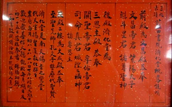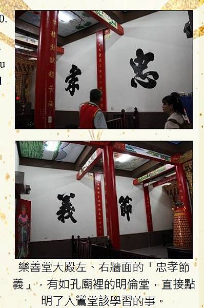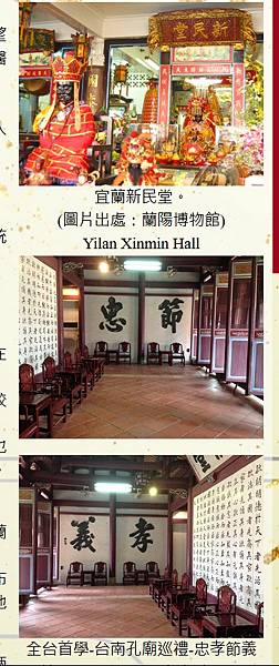 其次,宋代朱熹手書「忠孝節義」,成為各級學校校訓,台南首學明倫堂牆上就寫有「忠孝節義」大字,鸞堂也多在正廳壁上或製作匾牌宋代朱熹手書「忠孝節義」,也有鸞堂寫在絹布上,鸞堂內充滿了正氣和莊嚴的氣息。