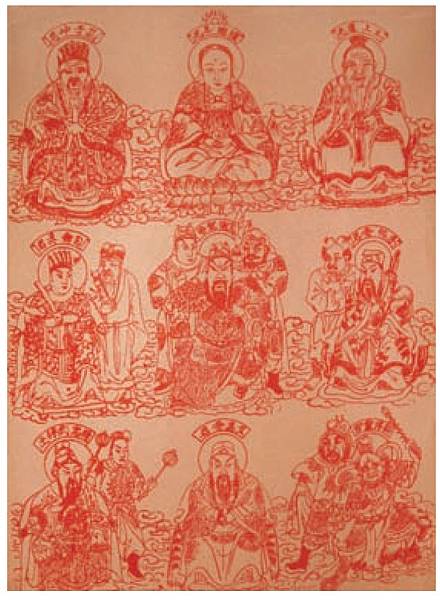本堂也供奉關聖帝君、孚佑帝君、岳武穆王、司命真君、文昌帝君、醫神孫思邈真人等神祇。前方一組神像頗有宜蘭風味(圖2、5、6)。