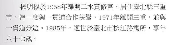 此時,一顆鸞堂界的「新星」在本堂誕生了,也改變了楊父的信仰,他從基督教信仰,改皈依在恩主公座前,成為虔誠效勞生。而楊明機在未來40年的歲月裏,通靈書寫10本鸞文,證明他是日據、國府時期,台灣本地鸞界最傑出、最優秀的鸞手之一。