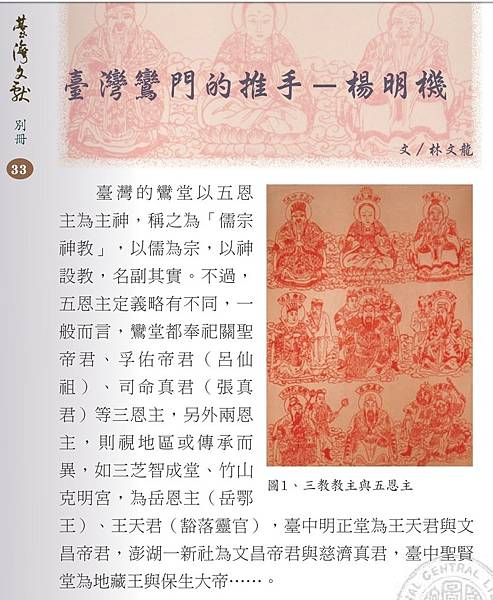 此外,在同年8月,本堂接受楊明機「制度性」鸞堂的建議,再度出版他在昭和11年(1936)書寫的《儒門科範》。該書內容頗為豐富,規劃孔子神殿祀位擺設,祭孔釋奠典禮的程序、音樂,各神祇聖誕使用的祝文、祭文、表文,超度祖先的牒文、疏文,每日禮眾神時課誦的寶誥、經典等。