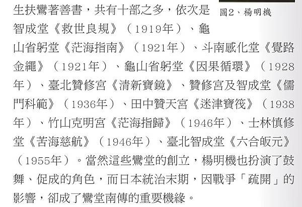 1 - 根據楊明機的《救世良規》中,建堂造 書記自敘,他在甲寅年(1914)秋到智成堂訓鸞。當時年僅16歲,經歷6年,到己未 (1919),訓鸞成功,始能通靈造書。