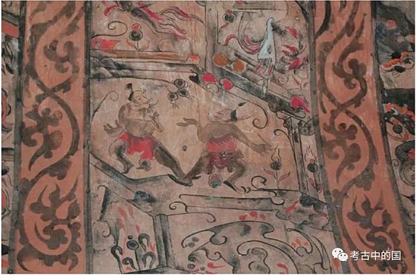 在東墓的天頂上還發現了一幅《相撲圖》,非常逼真,兩個大力士頭頂都扎著朝天辮,通身除了一件小短褲和束腰帶外,幾乎一絲不掛,瞠目相對,擺出進攻的姿勢,眼見一場較量一觸即發。